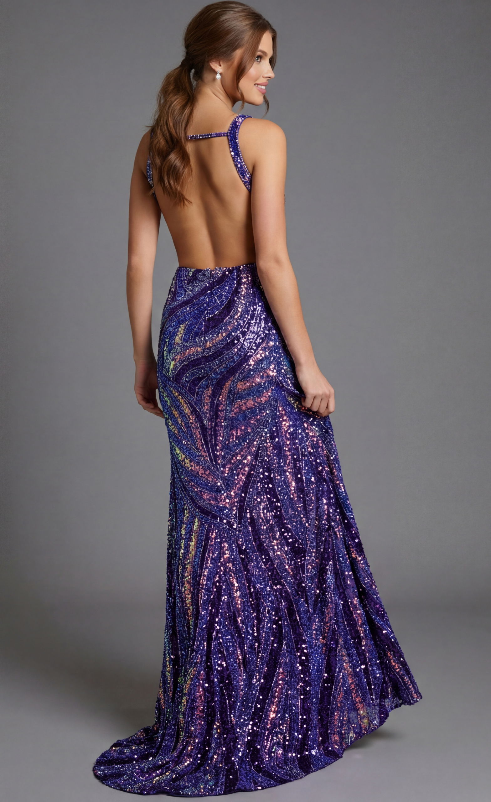 Deep V Purple Sequin Gown with Side Cutouts 47793