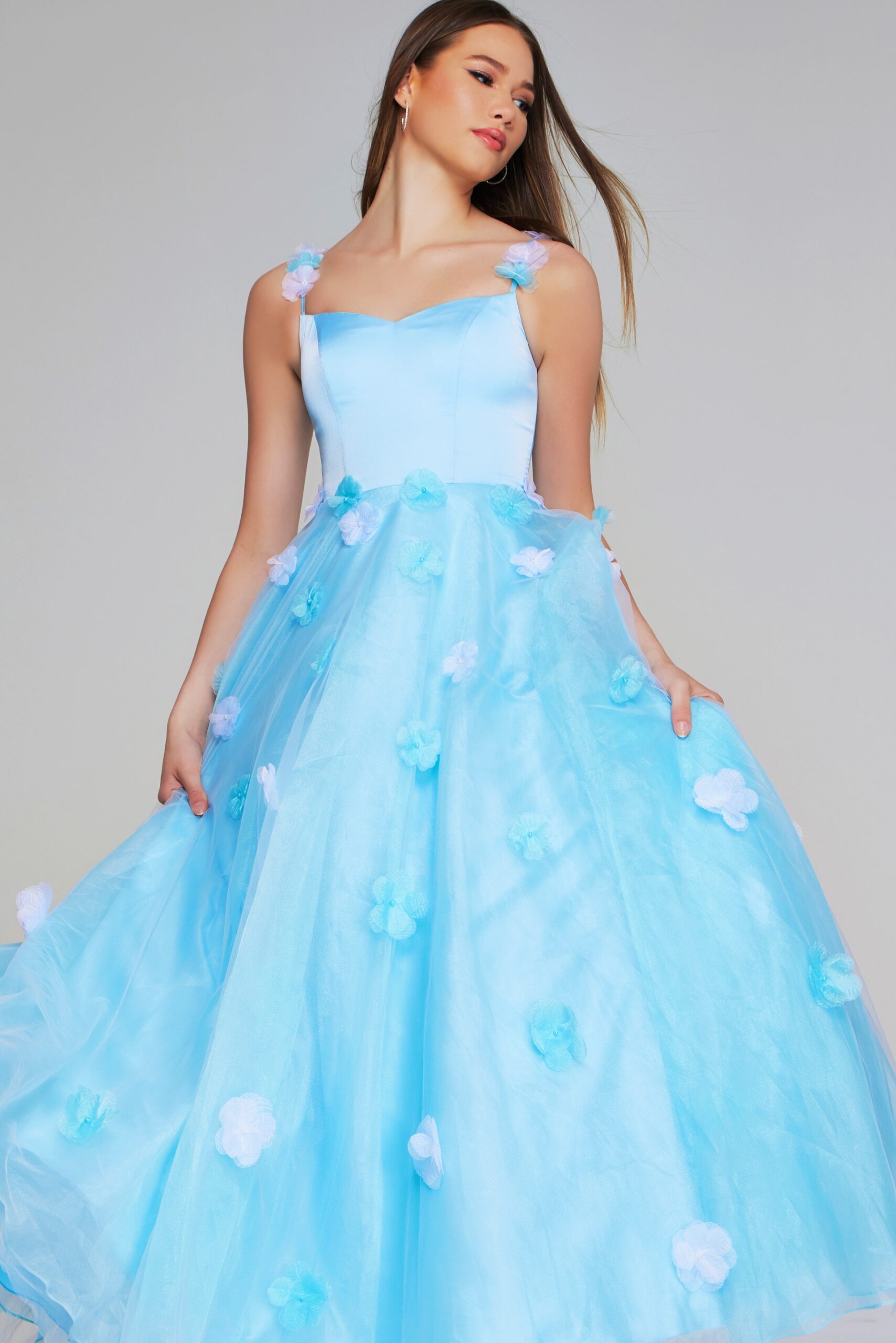 This darling floor-length ballgown features a sweetheart neckline and delicate sleeveless design. The dress is adorned with charming floral rosettes, offering a whimsical and enchanting look. Made from layers of tulle fabric, it provides an ethereal quality that captivates at every turn.
