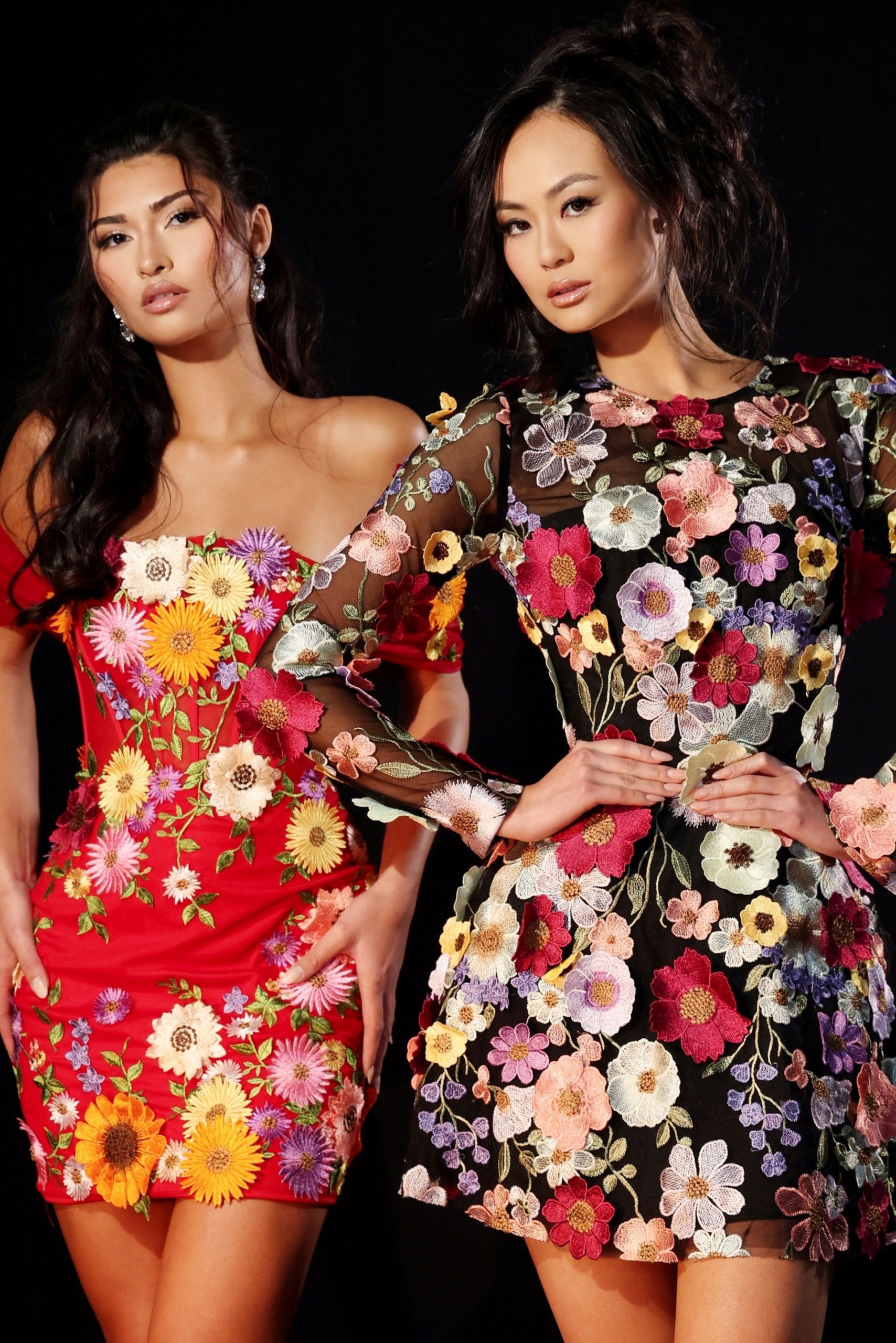 3D Floral Appliqués, Sheer Bodice, Layered Floral Patterns