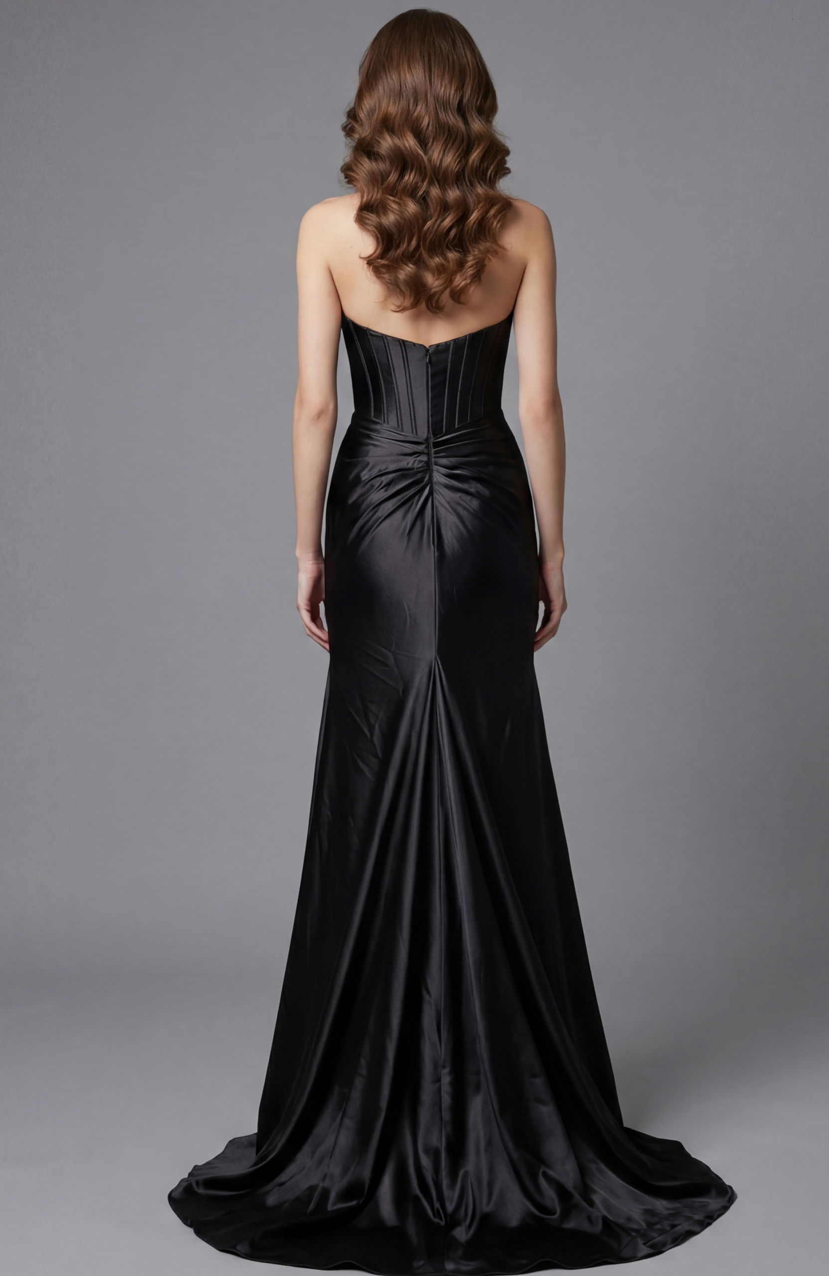 This striking gown features a daring halter neckline with a plunging deep V design. The silhouette is fitted through the bodice, showcasing a sleek wrap-style waist that enhances the figure, and flares into a floor-length skirt with a dramatic high slit. The back is elegantly low, adding an alluring finish to this captivating design. Perfect for making a bold statement at any formal event.